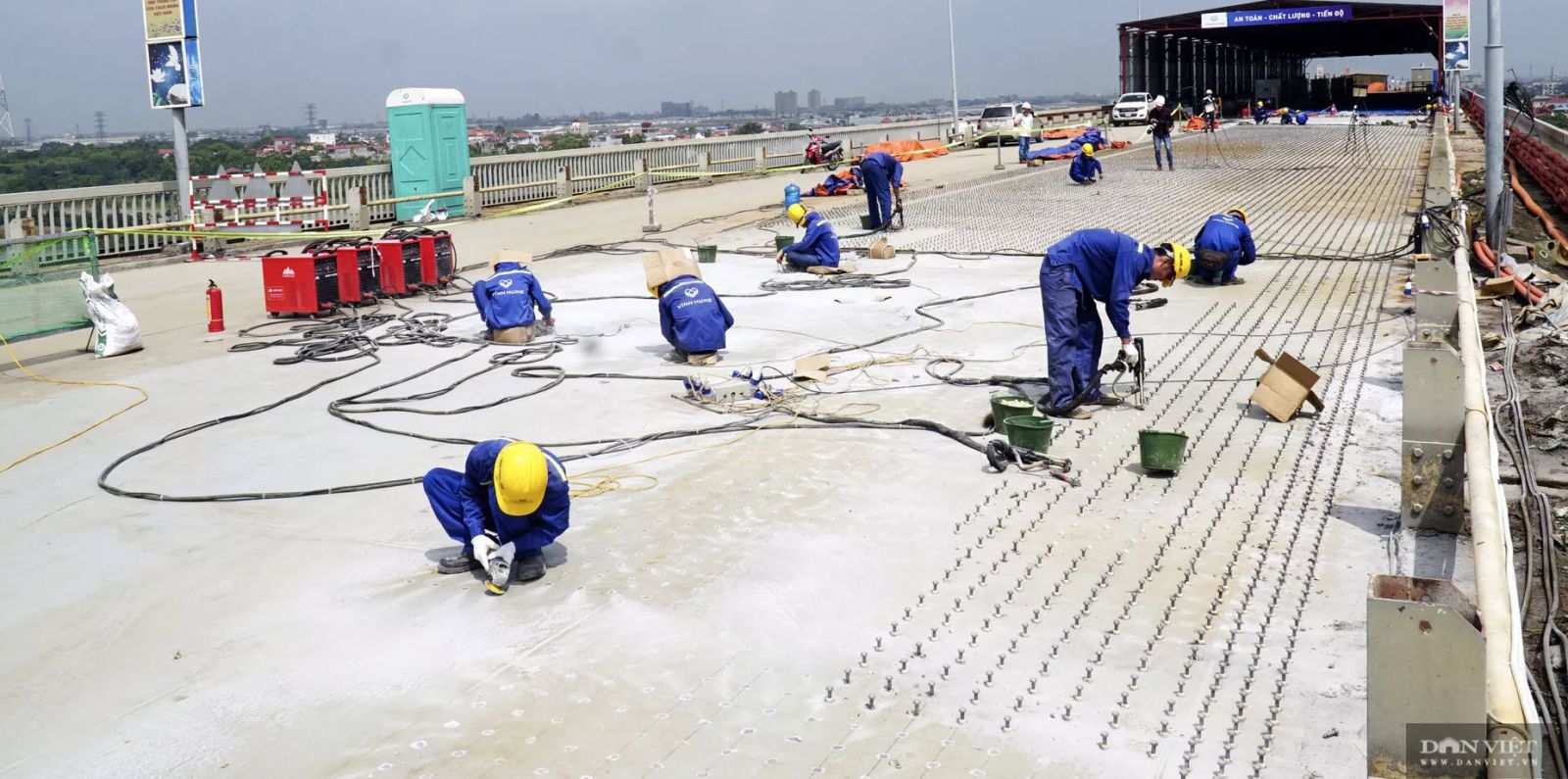 Sau hơn một tháng cào bóc và vệ sinh bề mặt cầu Thăng Long, nhà thầu bắt đầu thực hiện kế hoạch hàn 1,5 triệu chiếc đinh neo lên bề mặt cầu Thăng Long.